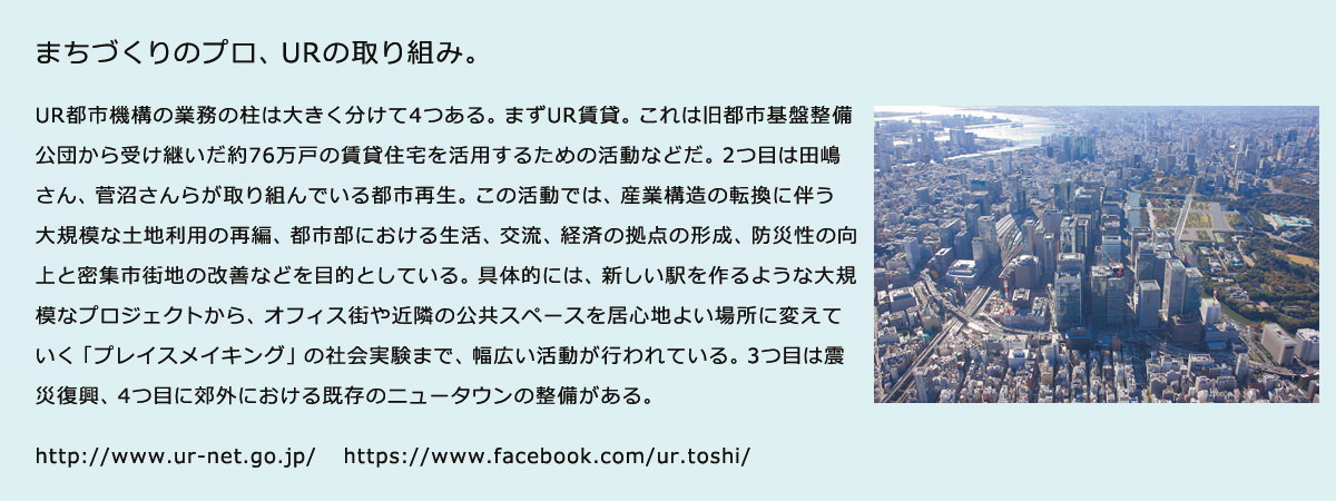 菅沼さんは「八重洲のDNAみたいなものを、どう伝えていくかは、まちづくりをする者の腕の見せどころだと思います。URもその一員として、地元の方々、民間企業の方と一緒に取り組んで行きたいです」と意気込む。