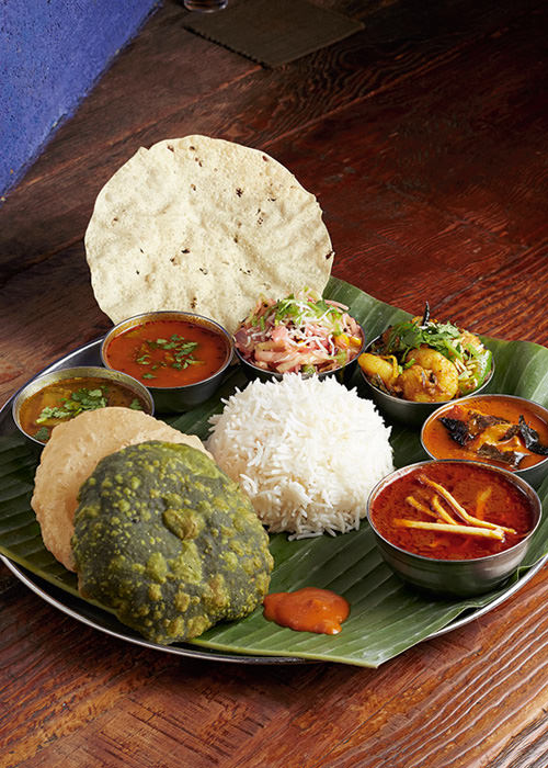 人気の定食「ダバミールス」では、バナナの葉の上にインドの最高級米バスティマ・ライス、揚げパン、トマトベースのラッサムスープ、豆のスープカレー、魚や小エビのカレー、黒胡椒がきいたチキンカレー、野菜炒めなどがつく。インド流にライスを手で混ぜ、カレーにおかずを足しながら好みの味を作るのも、なかなか楽しい。