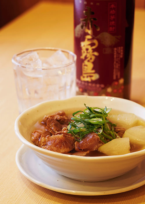 ご主人が鹿児島出身とあって、店の棚には森伊蔵、魔王、晴耕雨読などの芋焼酎がずらり。当然、酒の肴も充実しており、自家製の新鮮野菜が使われた料理や、旬の魚料理が揃う。特に、すっきりと透明なスープが特徴の牛すじの煮込みは、4時間かけて余分な脂を落とし、肉の旨味を凝縮させた逸品だ。胡椒をかけていただこう。