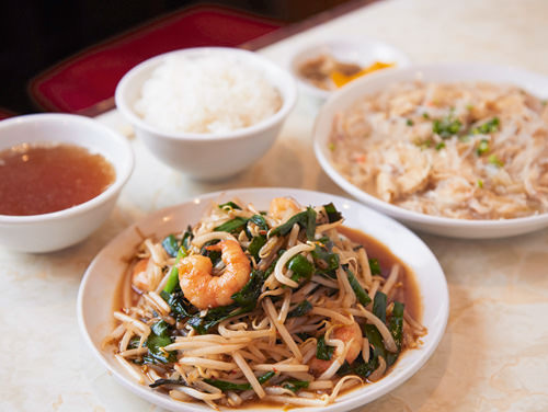 路地に建つ古いビルの半地下にある隠れ家的洋食店。くつろいだ雰囲気と親しみやすい洋食のラインナップで、1961年の創業以来のファンも多い。定番のシャトー風スパゲティはエビ、カニ、あさり、マッシュルーム、ベーコンがたっぷり入ったひと皿で、バターの風味と隠し味のチーズ、刻んだピクルスがアクセントを添えている。