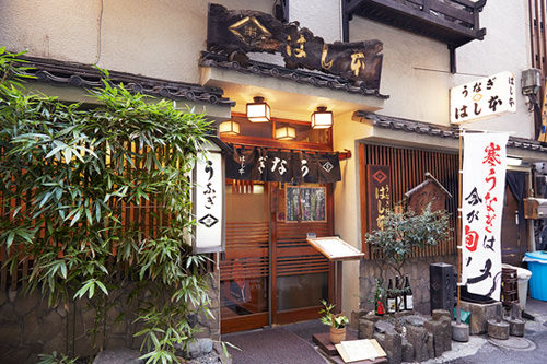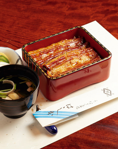金の文字が躍る一枚板の看板に、紺地の暖簾が歴史を感じさせる一軒。夜は注文を受けてから鰻を割き、焼いて、蒸して、70年以上守られた秘伝のタレで蒲焼にしていく。お新香で、あるいは川魚の刺身で一杯呑みつつ、鰻重を待つ時間も贅沢の極みだ。甘さをおさえたタレ、和歌山産の山椒の香りが、ふわふわの蒲焼を引き立てる。