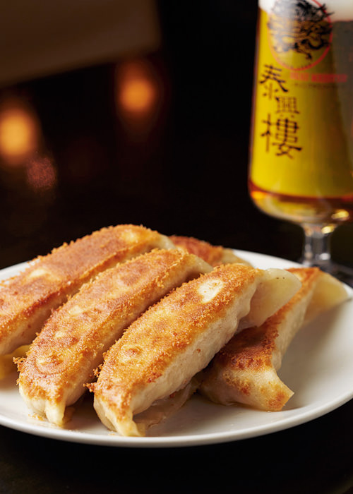 泰興楼の名物といえば、長さが12センチもある特大の焼餃子。こんがりと焼き色のついた皮はもっちりと厚め。にんにくは使っておらず、醤油の香りと野菜の甘味がふわっと広がる軽やかな味わいがくせになる。まずは何もつけずに食べ、次はラー油で、オリジナル調味料のC八醤(シーパージャン)でと、味の変化を楽しもう。