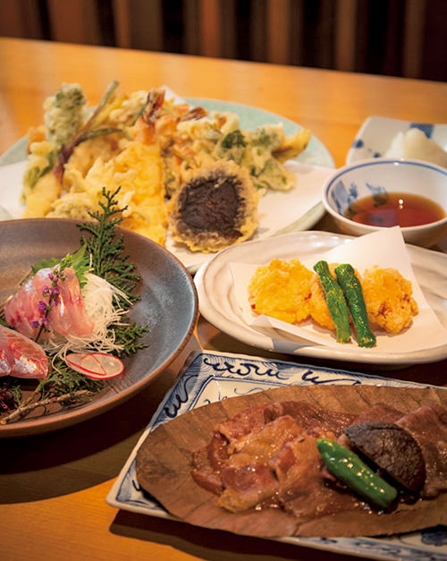 右下・飛騨牛朴葉味噌焼き1620円、左下・刺身盛り合わせ1620円、右上・海老しんじょ揚げ735円、左上・天ぷら盛り合わせ1620円、(単品追加・白きす天519円)
