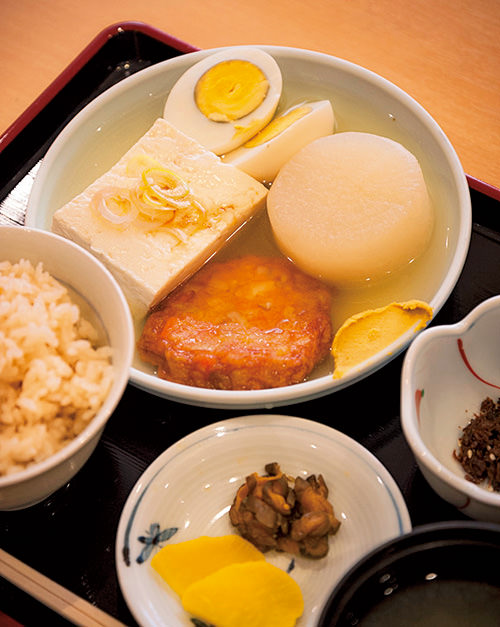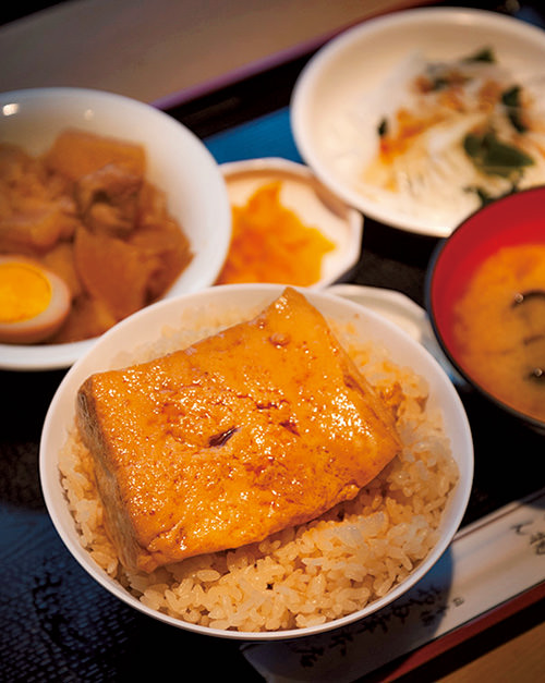 大正13年創業の関東風おでんの老舗。いわゆる関東煮で真っ黒い汁が特徴である。おでんはもちろんだが、ここの名物は「とうめし」。常連客の「茶飯に豆腐をどんとのせてくれないか」のひと言で生まれた一品で、醤油で炊いたご飯と、甘い出汁で煮た木綿豆腐の好相性にファンが多い。夜は単品だが、ランチでは「とうめし定食」として出される。