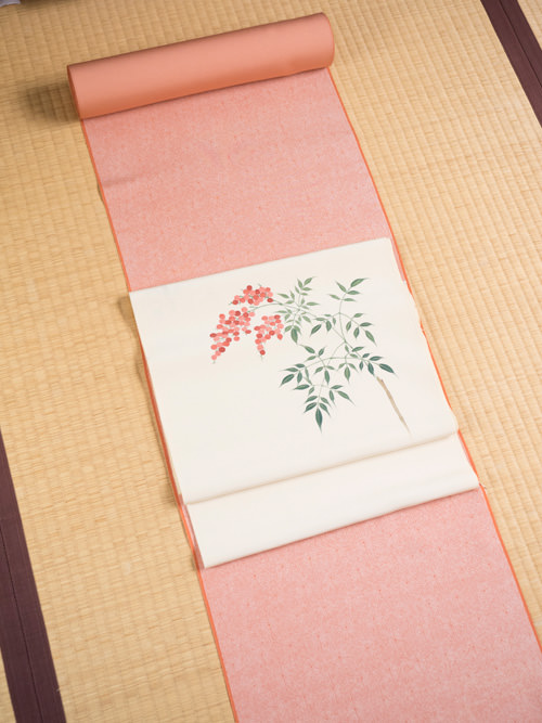 そう言って、出していただいたのが、南天の素描の染帯。南天の朱色とコーディネートして、同系である