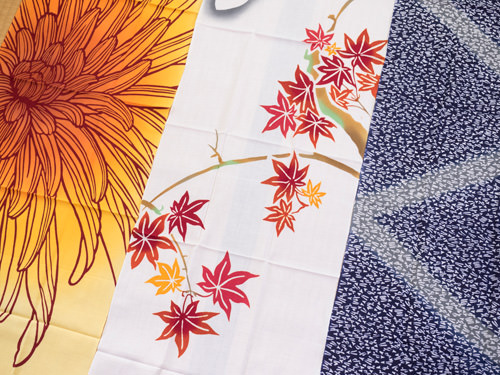 手ぬぐい左から「菊」1,900円、「月に楓」1,250円、「山道」1,500円