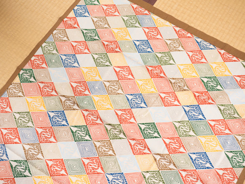 そして、今回は手ぬぐいや風呂敷、お膳掛けについても紹介しよう。竺仙では、それらも毎年新作がお目見えする。反物を長方形の型に折りたたみ、一気に染料を注いで染める