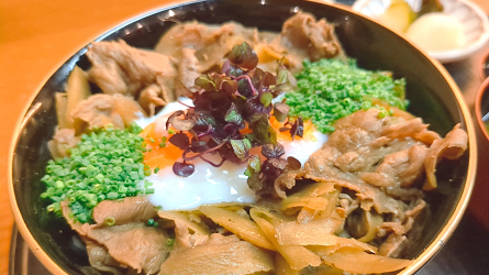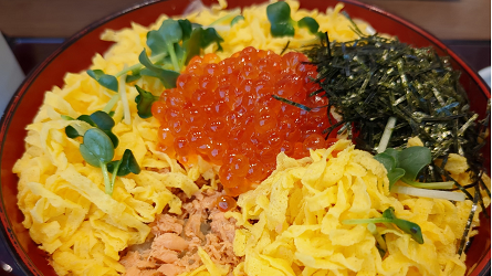 嶋村さんの錦どんぶりは彩り豊か。光り輝くいくらとふわふわの錦糸卵の下には、鮭、ひじきの煮物、ガリも隠れています。