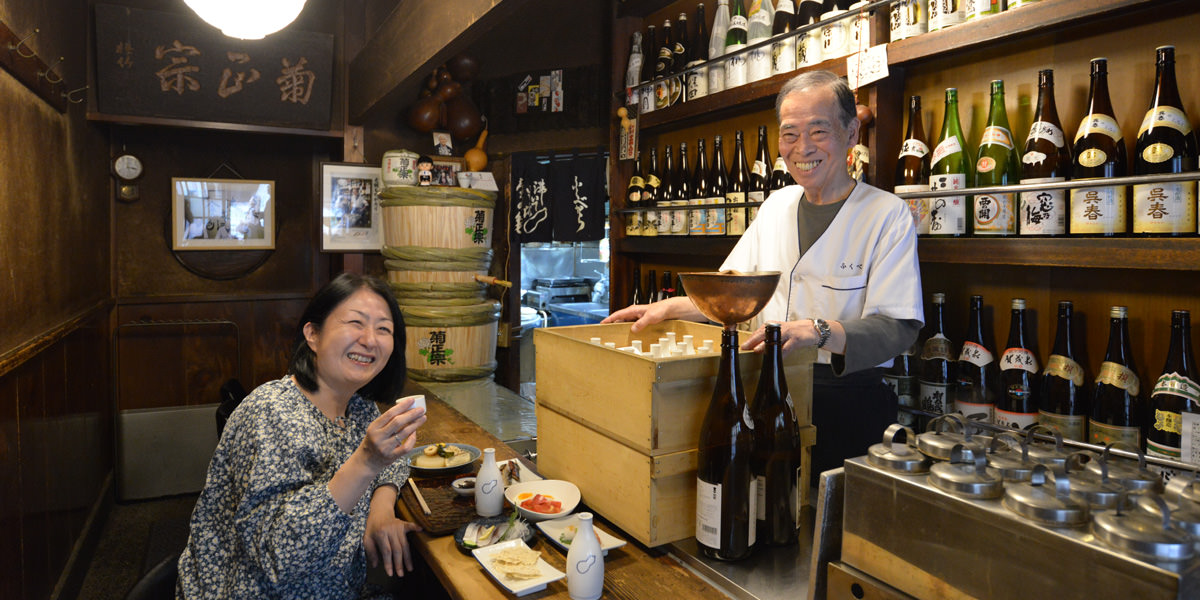 「ふくべ」ご主人の北島正雄さんと、“一斗ちゃん”の愛称で名高い酒豪の紀行作家・山内史子さん。