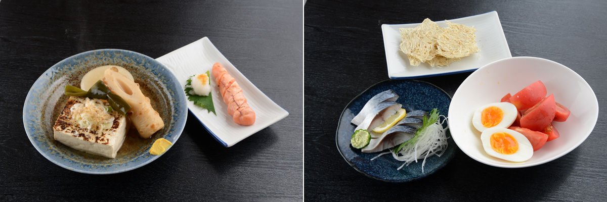 写真右:最近では居酒屋でもなかなかお目にかかれないたたみ鰯432円、きりっと酢がきいたしめ鯖648円、シンプル・イズ・ベストのトマトサラダ(玉子付)594円。料理のほとんどは432円~648円、日本酒は1勺594~702円と、財布にやさしい価格なのが嬉しい。