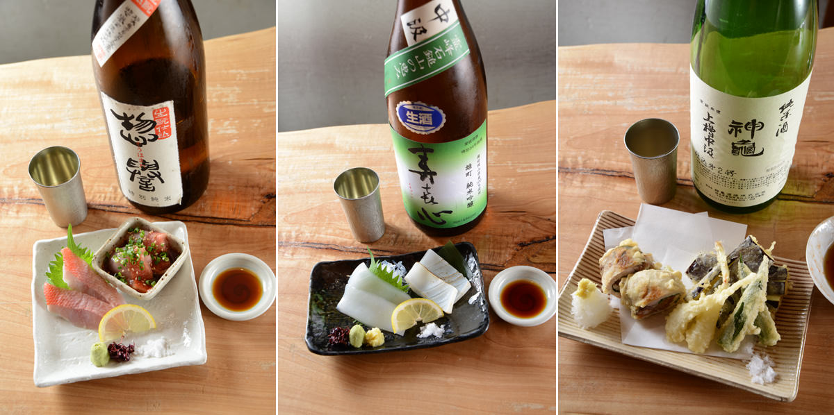 写真左:「惣誉 生酛特別純米酒」120ml、860円。と金目鯛の刺身・漬け(各500円)の盛り合わせ。漬けのたれはほんのり甘め。にんにくをきかせてあり、味わいのしっかりした酒と絶妙に合う。