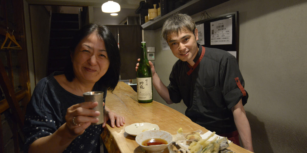 「川口酒店」店長の山田隆之さんと紀行作家・山内史子さん。山田さんがすすめる旨い酒と料理で山内さんも絶好調!
