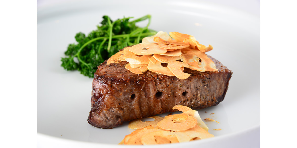 「島」のステーキはロースにしろフィレにしろ、脂肪の甘味、肉の柔らかさを身上とする一般的な黒毛和牛ステーキの風趣とはいささか異なる。まず、よく切れるナイフを入れると、確かな感触が手に官能をもたらす。口に含めばグッグッと自然にかみしめる硬質感の中から、脂肪と肉汁のうま味がとけ合った滋味が広がる。そこにはジビエ(狩猟肉)の野趣にも一脈通じる爽快感がある。このことは、アミノ酸的旨みが明確なフィレに、より端的である。