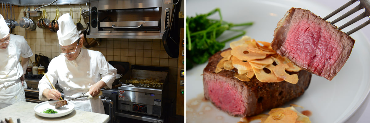 写真右:電源による遠赤外線と炭火を併用した「窯」と呼ばれる特注のロースターで焼くテンダーロイン(フィレ)のステーキ、単品150g14040円。肉本来の濃厚で雄々しい旨みが広がり、野趣にも通じる爽快感を堪能できる。店で別途用意するロース肉のステーキも同額で単品150g14040円。