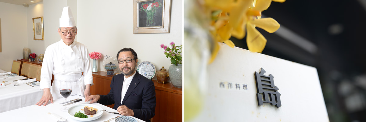 写真右:「西洋料理 島」のシンプルな看板。お昼のランチコースは6480円と10800円、夜のディナーコースは19440円と24840円、サービス料は別途10%。店は大島シェフが供する技とおいしさに魅了された常連客でいつも一杯、予約を。