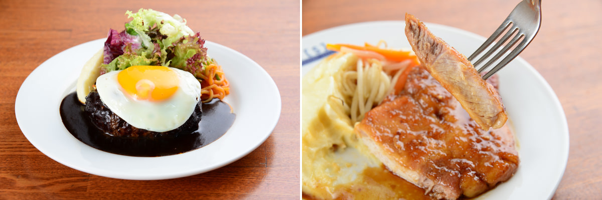 写真左:肉塊を食べるダイナミズムを表象したランチメニュー、目玉焼き付きハンバーグ(スープ・ライス付き)1150円。グッと切って頬張れば肉の旨みがガツンと広がり、パワフルな味わいがどこまでも名残深く残る。