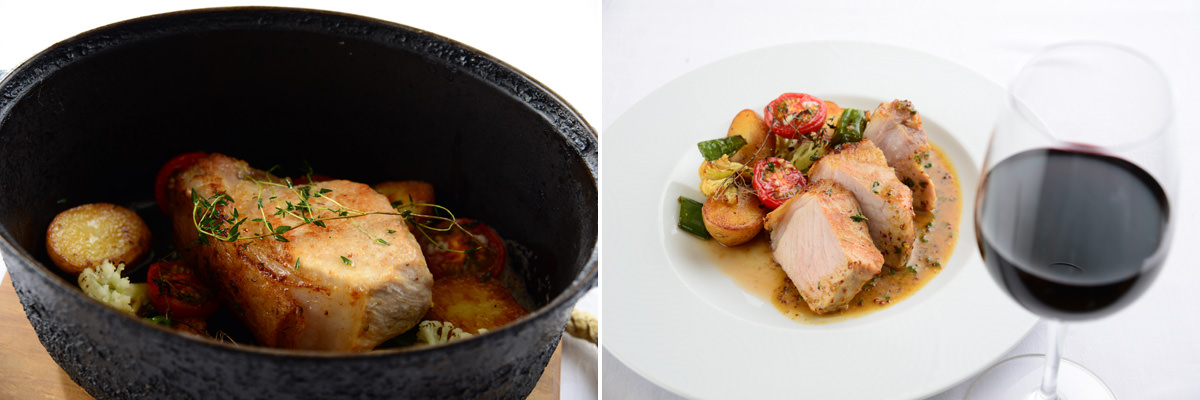 2人前で注文する千葉県産林SPF豚のロティ 粒マスタードソース2160円は、夜のアラカルトメニュー。ココットで豚の塊肉を豪快かつ繊細に焼き上げ、ボリューム感のある厚めのカットで供される。シンプルで奥深い豚肉の脂と肉の旨みを同時に味わえる。