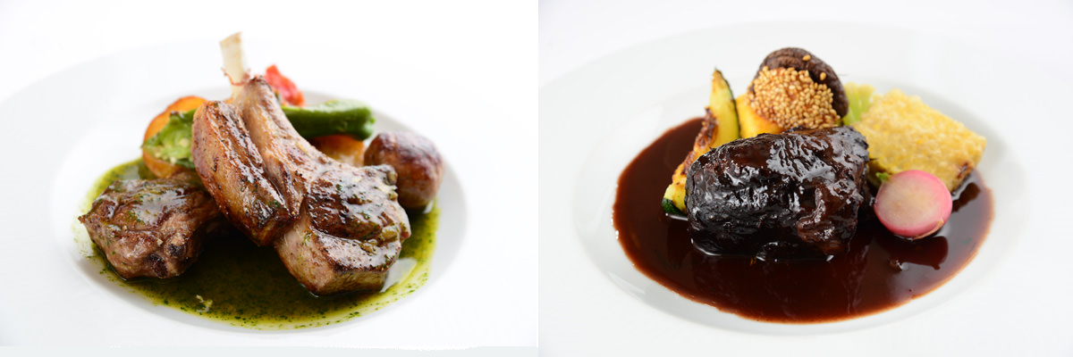 写真左:夜のアラカルトメニュー、仔羊のロースト バジリコソース じゃがいものグラタン添え2592円。フランス料理の王道をゆくシンプルな肉料理に、榊原シェフの技が光る。