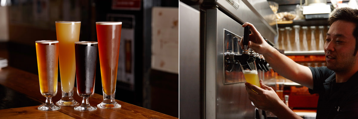 写真左:大阪・箕面ビール「ペールエール」250ml830円(500ml1300円)は、ふっくら丸みを帯びた味わいのなかにほんのり苦みを秘めている。写真中:トロピカルな香りとしっかりした酸味でインパクト大の長野・志賀高原ビール「SNOW MONKEY IPA~FujiRock ver.~」250ml830円(500ml1300円)。期間限定メニュー。 写真右:ビールを扱う幸城さん。