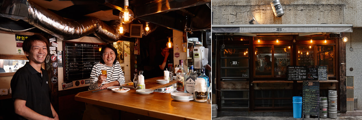 写真左:際限なく飲めることから“一斗ちゃん”の愛称を持つ酒豪紀行作家・山内さんと、しっかりした味わいのアンバー系がお気に入りだという幸城さん。 写真右:店舗入り口。