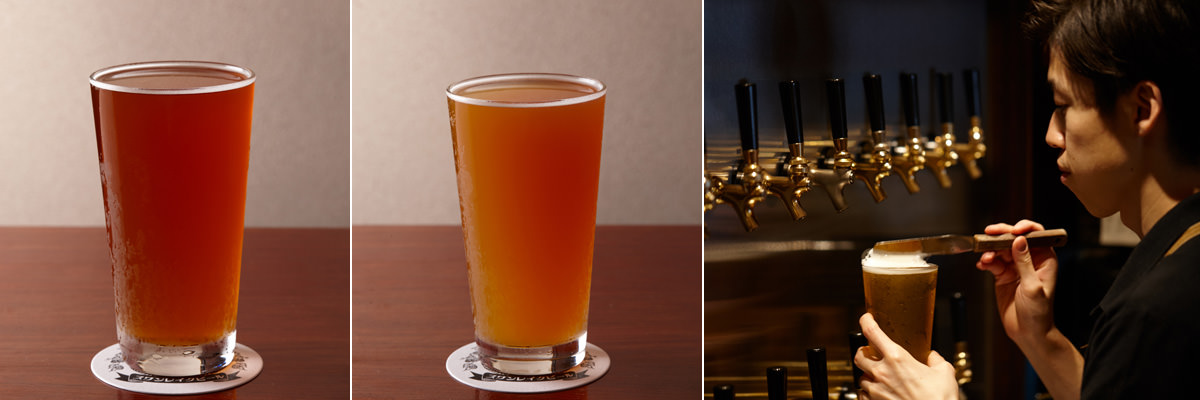 写真左:奥左は福島路ビールとのコラボ「いつものFM」、奥右は三重県の伊勢角屋ビールとコラボ「I'm So Wired」、手前左は秋田あくらビール「ふたりがかり」、手前右はNova Paka「Brouczech Dark」。 写真右:グラスにビールを注ぐ様子を見るのも楽しみの一つ。