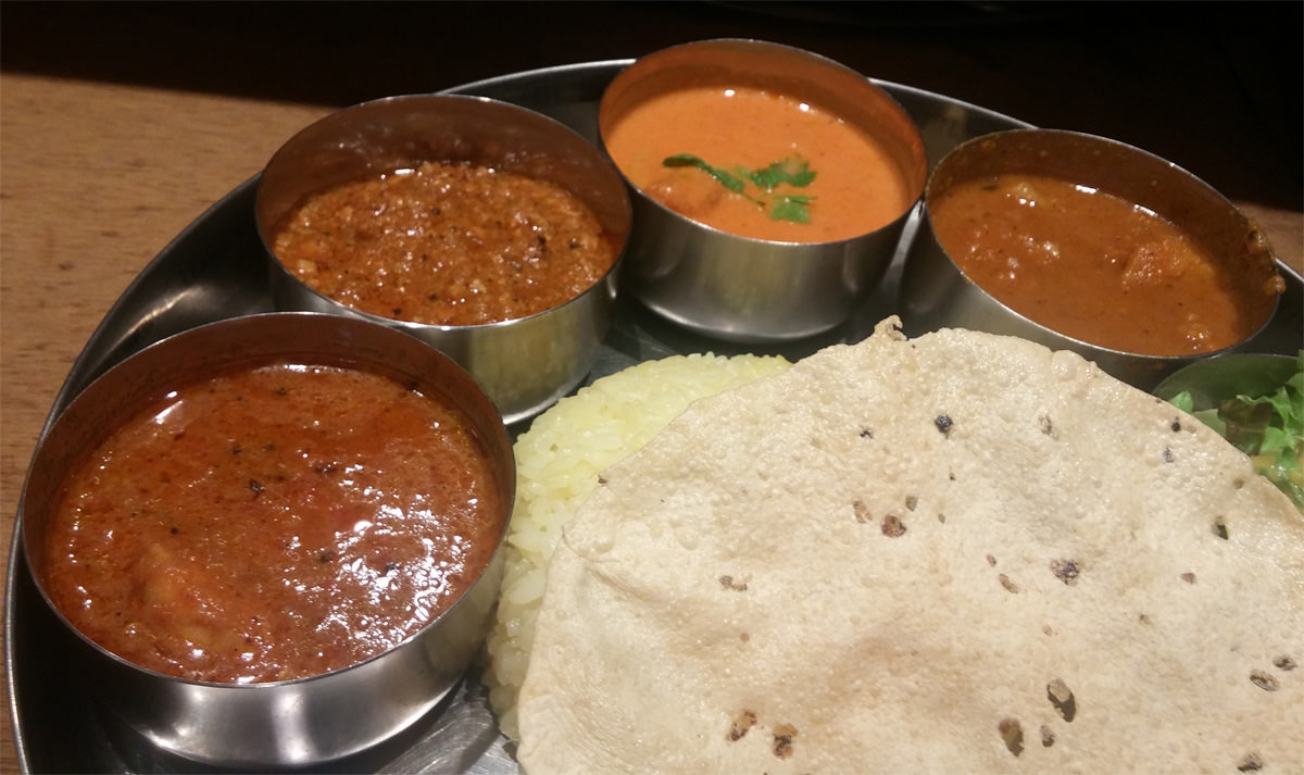 この他、サラダかヨーグルト、ライス、パパド(薄くパリパリに焼いた豆のクレープのようなもの)がついてきます。