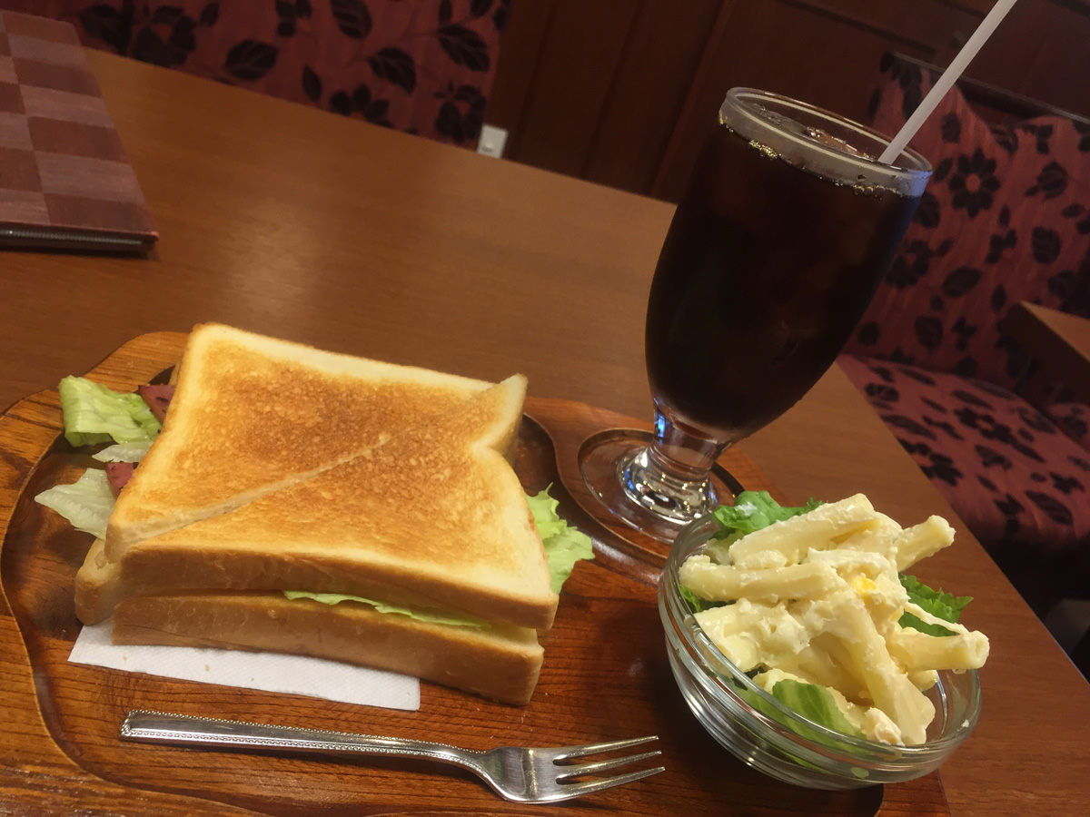 モーニングセット(ホットサンド・アイスコーヒー・マカロニサラダ)を注文。