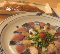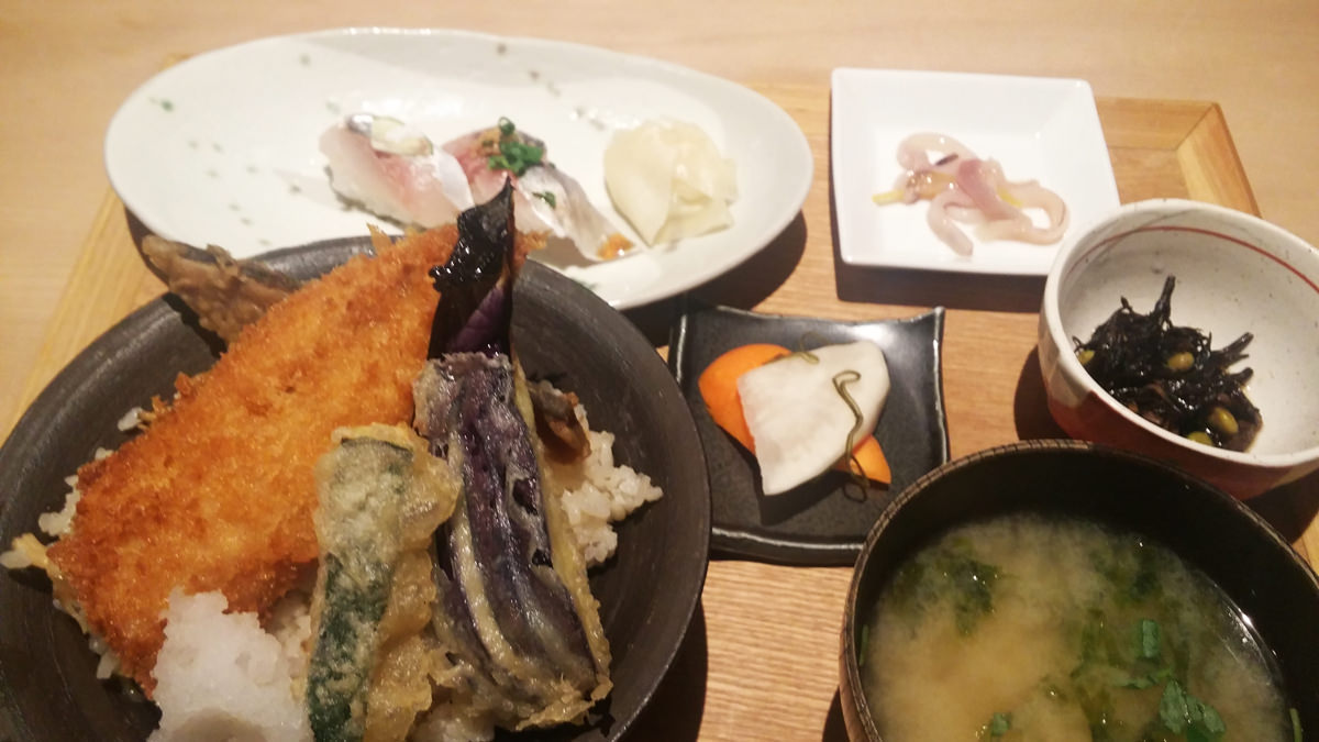 ランチの種類が多く迷いましたが、「活あじフライとあさり飯丼」を注文。 その名のとおり、あじフライとつけあわせの茄子とズッキーニの天ぷらのの下が、 あさり飯になっています。 さらに活あじ寿司が2貫、小鉢2つ(いかの塩辛、昆布と大豆の煮もの)、 おしんこ、お椀もついています。 沢山の海の幸を堪能できて、大満足。