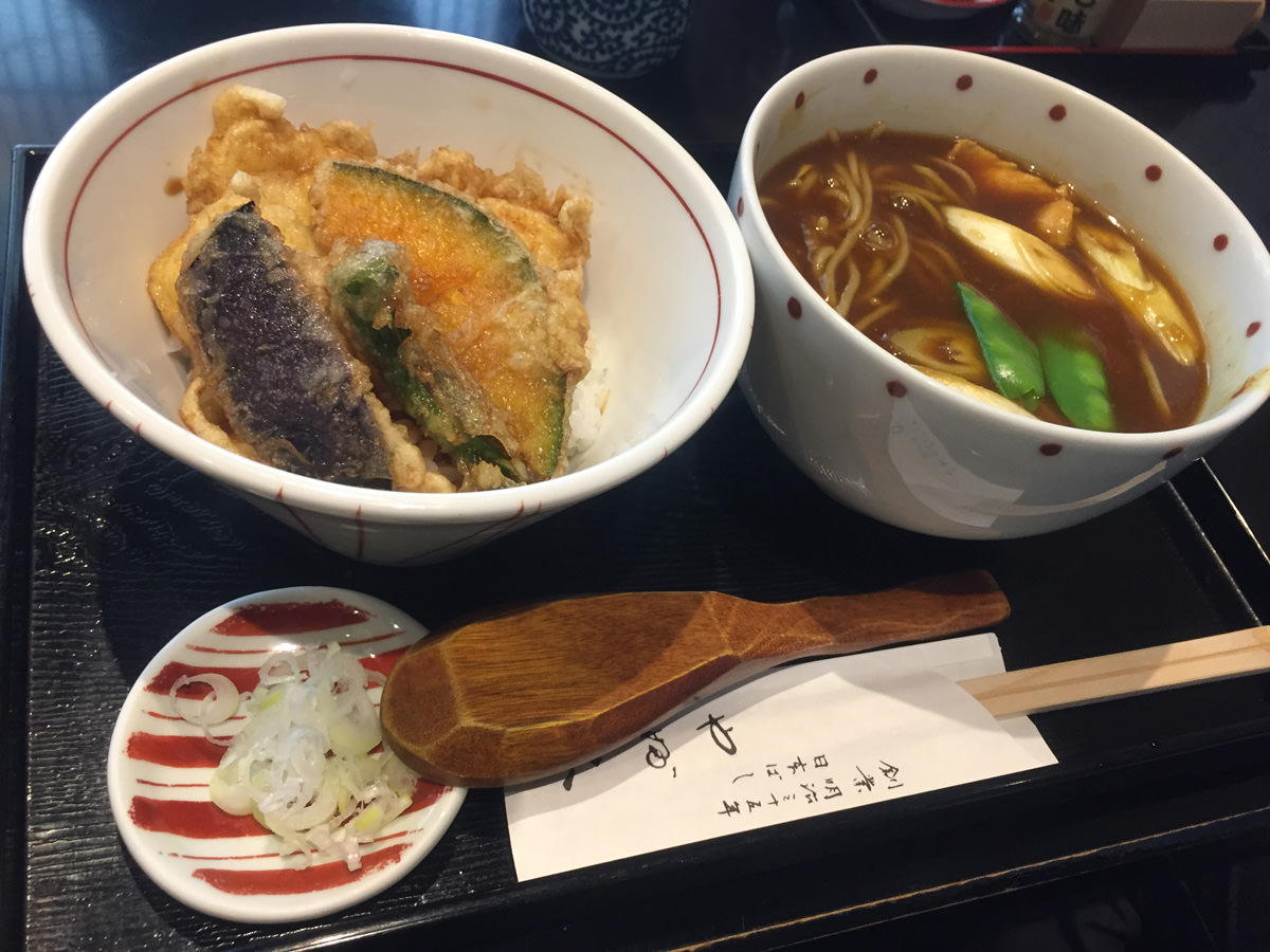 本日は、いか天丼&カレー南蛮そば(鶏肉)。