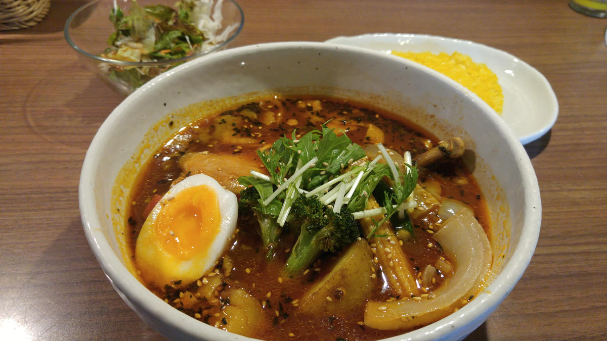 特製チキンカリーを注文。具はチキンと野菜8種、半熟玉子です。