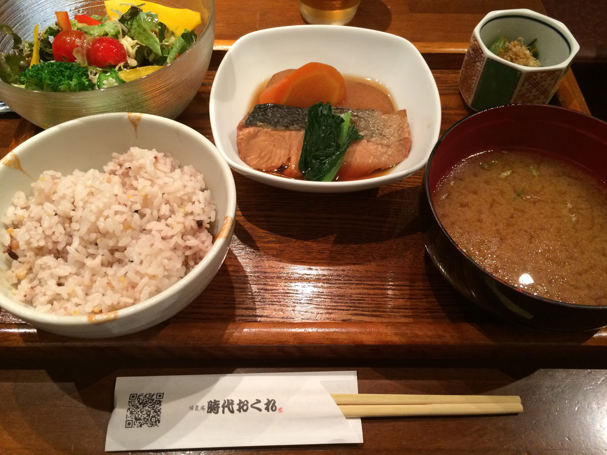 日替わりランチの「焼き鮭と野菜の炊き合わせ」を注文。 ご飯、みそ汁、大ぶりのサラダ、ほうれん草のおひたしの小鉢がついてます。