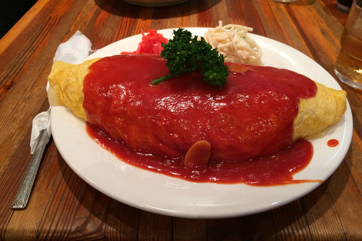 玉ねぎと鶏肉の入ったケチャップライスが卵に包まれ、 上からトマトソースがたっぷり。 なんとなく子供時代を思い出す見た目です。
