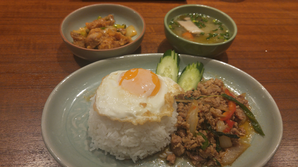 ランチは6種あり、私は大好きな「ガイ ガパオ ラーパオ(鶏肉のバジル炒めご飯」を注文。