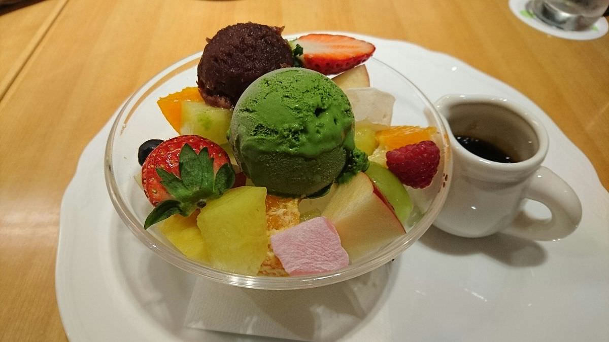 宇治抹茶あんみつをオーダー。フルーツは期待通りの美味しさ。