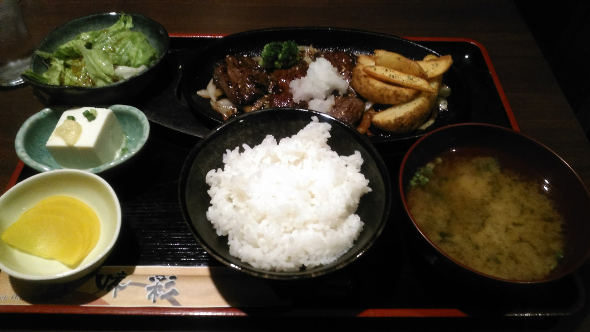 注文したのは、「牛ハラミステーキ 鉄板焼定食」。 ごはん・味噌汁の他、サラダ・お豆腐・おしんこが付いています。 アツアツの鉄板で焼いた牛ハラミステーキ、美味しいです!