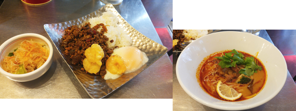 今日は[麺]若鳥と野菜のトムヤムガイヌードルと[飯]福井県産もち海老と豚鳥ミンチのガパオライス 温泉卵付
