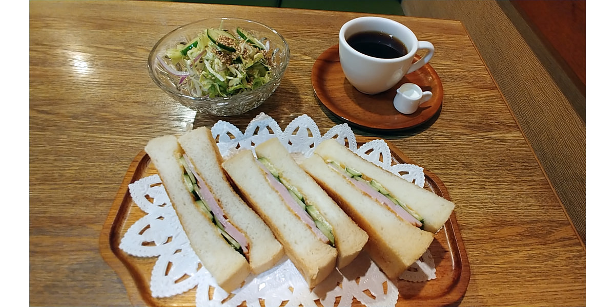 軽くトーストされた厚切りパンにハムとキュウリが挟まっています。