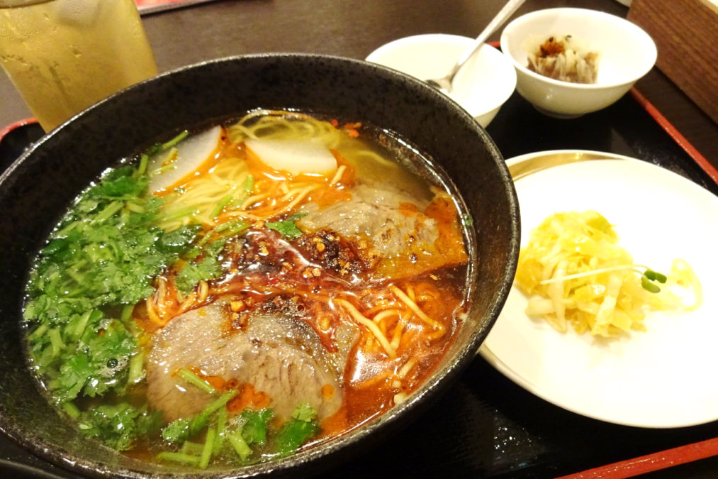 スープは牛肉のダシが効いたあっさりめなお味ですが、あとからラー油とパクチーのパンチが効いた風味がやって来ます!