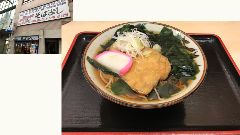 私にも蕎麦が到着。悠久の時を経て、ここ日本橋で江戸時代のファーストフードを食べるんだなあ、と感じ入りながら、一口目をすすります。立ち蕎麦らしい無骨な佇まい。蕎麦はやや細め。柔らかすぎるでもなくコシが強すぎるでもなく、ずずずっと食べるのにちょうど良い塩梅。わかめの味が滋味深く、甘めに炊いてあるきつねはアクセントになっています。