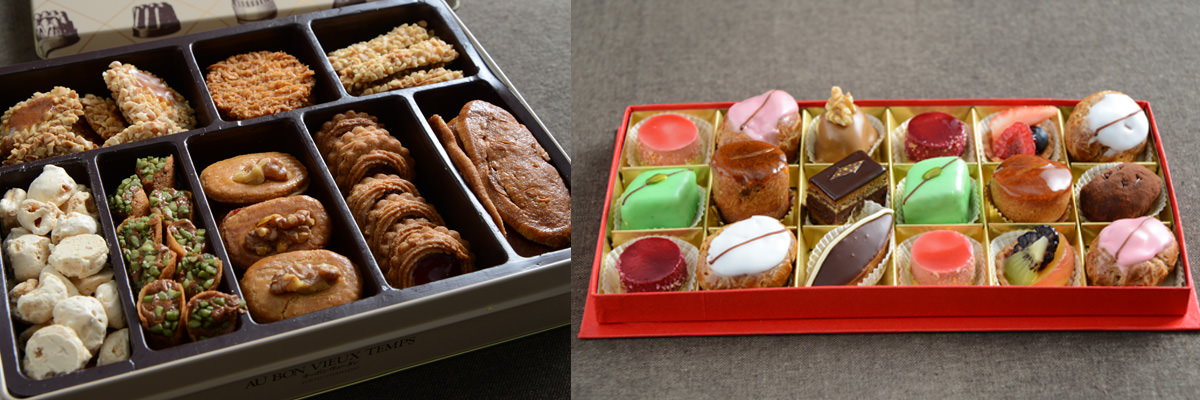 写真右:プティ・フール・フリアンディーズ(18個詰)2700円。シュー・ア・ラ・クレームやオペラなど小さなガトーの詰め合わせ。真っ赤なパッケージも印象的だ。賞味期限1日。
