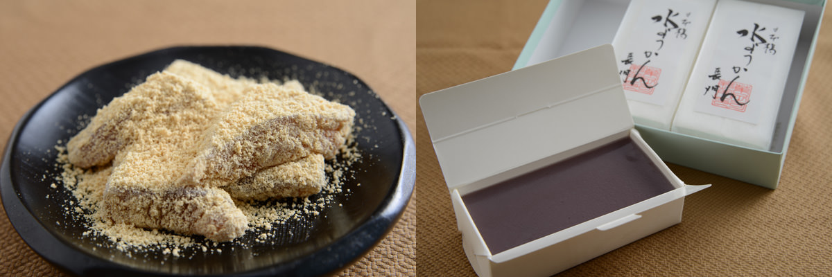 写真左:わらび粉で仕立てた久寿もち890円。「長門」の人気商品で、夕方には売り切れてしまうことも。夏場は冷蔵庫で15分ほど冷やして食べるのがお薦めだ。賞味期限2日間。