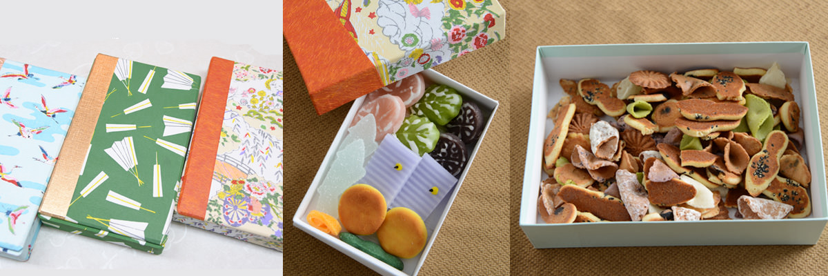 写真左/中:千代紙を貼った紙箱(千代ボール)に詰めた半生菓子2000円。季節ごとに意匠は替わり、初夏のこの時はホタルや鮎、朝顔などがモチーフに。木製の千代箱入りは6サイズあり、3000円~9800円。賞味期限7日間。
