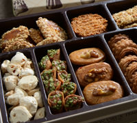 <日本橋海苔せんべい>山本海苔店は1869(明治2)年、明治天皇の京都行幸のお土産用に味附海苔を苦心して創案したことから宮内省御用達となった老舗。専門店ならではの旨味、香り、歯切れの良さにこだわった海苔はもちろん、関東のコシヒカリ種を玄米のまま低温保存した生地や、独自の醤油だれを使って紀州備長炭で焼き上げる昔ながらの製法など、こだわりが満載の「日本橋海苔せんべい」。本物のおいしさを手軽な手土産にぜひ。(角形6枚・丸形3枚入り)1080円。賞味期限150日。