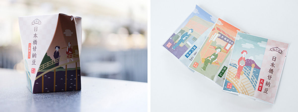 <日本橋甘納豆>初代栄太郎さんが創製して「甘名納糖」と命名。その後、甘納豆として全国に広まったという生粋の東京生まれの菓子。「日本橋甘納豆」は小豆を使った「大納言」、黒大豆を使った「黒千石」、さつま芋を使った「鳴門金時」の3種が揃う。長山さん的には、ふくよかな食感の「鳴門金時」がイチオシ。単品包装に描かれた絵は、栄太郎さんが日本橋に出てきて(大納言)、きんつばを屋台で売って(黒千石)、その後、成功して店を構えた(鳴門金時)という物語をイメージ。一方、詰め合わせ用のパッケージは日本橋をパノラミックに表現。単品(40g)270円、詰め合わせ(3袋)970円。賞味期限120日。