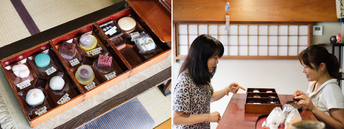 上生菓子主体のお店なので、レパートリーは100種以上、時季によって品揃えが大きく変わります。私のおすすめは定番なら「黒まんじゅう」「最中」、夏の時季には「水ようかん」「水の月」。そして夏は残念ながら作っていないのですが、絶対に外せない銘菓「若紫」など。伝統に忠実に、技を受け継ぎ磨き続ける老舗の品はことさら奇をてらわずとも、凛とした貫禄を感じます。手土産を渡す際に、先の注文方法や店内に立てかけられた創業時の木の看板のことなど、些細なサイドストーリーも一緒に伝えてあげると、いっそう喜ばれるのではと思います。