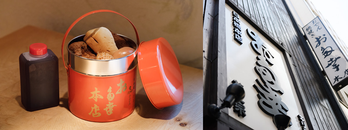 最後に、おでんといえば日本で一二を争う名店、『日本橋お多幸本店』の知られざる逸品をご紹介します。それは実はおでん種ではなく、おでんを入れる缶なのです。『お多幸』の創業者・太田幸さんは栃木県出身。夫とともに神戸に転居した後、関東大震災で多くの料理店が被害を受けた1923(大正12)年に日本橋に店をオープン。その後、銀座に移って以降、「お多幸」を名乗り、2002年に都市開発のため日本橋の現在の場所に移転しました(戦時中は一時閉店)。幸さんの友人で右腕として活躍し、戦後に店を再開した中村てふさん、その弟子の田中辰雄さんという直伝の味を受け継ぐのは、実は東京ではこの店舗のみ。