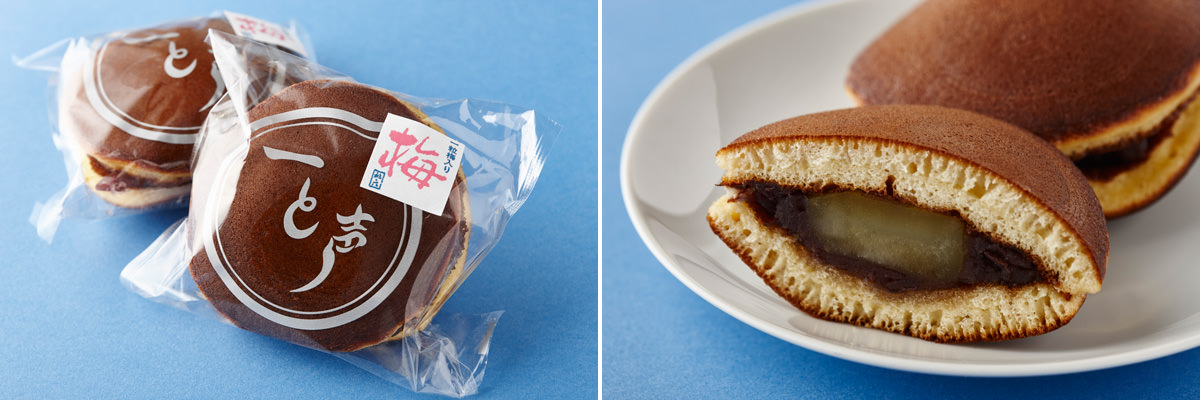 しっとりとした皮とたっぷりのつぶあんのどら焼き「一と声」。プレーンは180円。甘酸っぱい青梅がアクセントの「梅」190円と栗の甘露煮入りの「栗」210円。賞味期限3日。