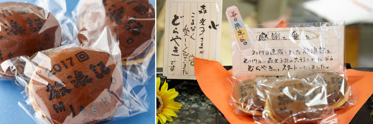 森光子さんの代表作「放浪記」の焼文字入りどら焼き(中はつぶあんのみ)180円も人気。賞味期限3日。