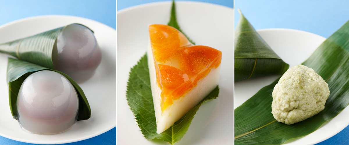 季節の生菓子も充実。左から、つるりとしたのどごしの水まんじゅうでこしあんと青梅を包んだ、目にも清々しい梅すいれん230円。水無月風に、甘酸っぱいあんずを甘さ控えめのういろうの上に敷き詰めたあんずういろう210円。青のりを練り込んだ麸まんじゅう230円の中身はこしあん。ごつごつとした見た目は、手練りの証。すべて賞味期限冷蔵で2日。季節のお菓子の販売期間は商品によって違うので、店頭にない場合はご容赦を。
