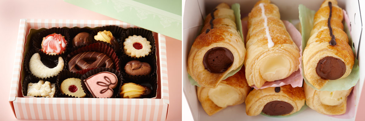 写真右:バターの香りが芳しいシラーロッケン。しっかり焼き上げたサクサクのパイ生地は、食べごたえも十分。とろりとしたカスタードクリームと、ガナッシュのような濃厚なチョコフィリングが詰まったチョコの2種類。各270円。消費期限1日。